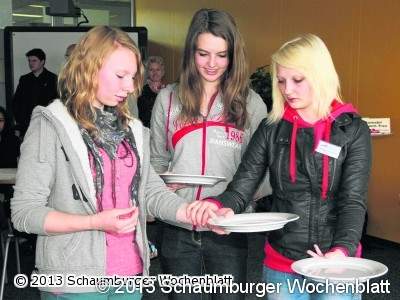 Am Tisch der angehenden Restaurant- und Hotelfachfrauen Swetlana Studjonow (Gasthaus Zur Linde in Rinteln) und Johanna Grünewald (Hotel Bad Hiddenserborn in Meerbeck) hieß es mit anpacken. Im Gepäck hatten die beiden Auszubildenden im zweiten Lehrjahr einige Teller, die die Schüler auf dem Handgelenk und Arm einmal selbst stapeln und möglichst unfallfrei tragen sollten. Was so einfach aussehe, sei in Wirklichkeit harte Arbeit – nicht nur beim Servieren, wie die beiden Mädchen verrieten. "Für eine Ausbildung in unserem Beruf fehlen junge Menschen, die wir heute dafür motivieren wollen", erklärte Swetlana ihre Teilnahme am Speed-Dating. Dabei könne jeder, der diesen Beruf erlernt, viel erreichen, wertvolle Kenntnisse und menschliche Erfahrung gewinnen. "Man muss nur mit Leidenschaft dabei sein, den Beruf leben und lieben", ergänzte Kollegin Johanna. Mit einem Gongschlag endete die Vorführung, bei einem zweiten saßen schon wieder neue Gesichter vor den fleißigen Informantinnen.