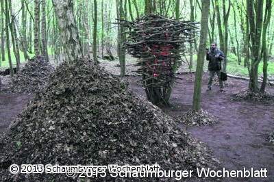 STADTHAGEN (bb). Zahlreiche Interessierte haben die Gelegenheit genutzt, sich in Wald und Flur rund um den Bruchhof auf Entdeckungsreise zu begeben. Bereits zum fünften Mal hatten der Kultur- und Sportverein "Tu Wat" und das Projekt Probsthagen zum Festival "Land Art – Naturkunst, Klänge und Illuminationen" geladen. Hier liegt ein großes, kugelförmiges Gebilde in einer Fichtenschonung, als Mittelpunkt einer aus Blättern geformten Ornamentstruktur. Aus dem Boden gewachsen, oder aus dem All hinabgestürzt? Brütet etwas im Inneren? An anderer Stelle scheint sich eine Schlange neben einer Art Altar aufzurichten. Immer wieder entdecken die Besucher kleine Waldgeister am Wegesrand, die sich in Baumstümpfen oder Astgabeln verstecken. Die Gäste schritten durch Tore, zusammengestellt aus Holzstämmen, über sorgsam verfremdete Brücken.