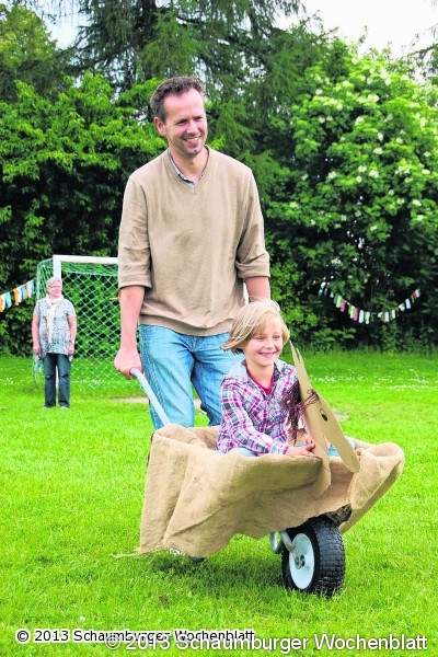 Knapp 100 Kinder meldeten sich zu dem Spektakel an. Die meisten von ihnen schlüpften wie ihre Erzieher in altertümliche Gewände und sorgten neben der passenden Dekoration auf dem Außengelände für den Mittelalter-Zeitgeist. Fern ab von elektronischem Know-how waren es die ganz einfachen Dingen, die die kleinen Ritter und Burgfrauen, zwischen einem Jahr und sechs Jahren jung, faszinierten: deftige Speisen wie Stockbrot und gefülltes Fladenbrot, alkoholfreier Honigwein, Lanzenstechen, Sackhüpfen mit anschließendem Dosenwerfen, eine Schatzsuche nach Edelsteinen, das Anfertigen von Schmuck und Jutesäckchen sowie Weben und Trommeln. Während es beim "Pferderennen" in Schubkarren in waghalsiger Schräglage um einen Stock herum ging, trabten wenige Meter weiter zwei echte Gäule vom benachbarten Bauernhof Geißner. Hoch zu Ross und im rosa Gewand lächelte auch die vierjährige Finja dem "Volk" zu ihren Füßen zu. Am liebsten hätte sie noch mehrere Runden gedreht, wie sie verriet. Dafür hätte sie sich allerdings wieder ganz hinten in die Schlange einreihen müssen. "Nein, das dauert ja viel zu lange." Also schnell auf zum verzauberten Fußballtor auf dem Bolzplatz, das die Tür zur mystischen Welt öffnete. Eine Märchen-Fee erzählte von stinkenden "Pferdeäpfeln", die sich in Goldmünzen verwandeln, von einem Drachen, dessen Feueratem Wiesen und Felder vernichtet, und von einem Riesen namens "Wölfel", der so stark ist wie ein Baum.