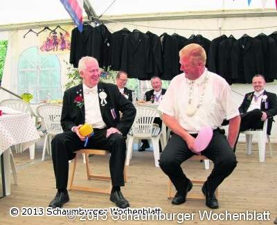 STADTHAGEN (mh). "Klimaanlage", dieser Ruf ist im Zelt des Bernhardinerrotts unerhört geblieben. Wozu eine Klimaanlage, wenn die Kühlung auch von innen funktioniert, dachte sich Rottmeister Horst Wittkugel und hatte entsprechend mit reichlich Kühlmittel aus der Zapfanlage vorgesorgt. "Unser Zelt ist gut gefüllt und wir haben Spaß", so seine Einschätzung am Donnerstagmorgen. Im Rottzelt im Garten der Familie Wittkugel sangen sich die Rottbrüder durch das Repertoire ihres Liederbuches. Pünktlich zum Einreffen der Chargierten überraschten ihn seine Rottbrüder mit einer kleinen Runde Roulette. Schließlich hat der Rottmeister als Leiter der Spielbankenaufsicht Sachsen-Anhalt von Berufswegen mit dem Glücksspiel zu tun. Am Ende konnten sich die Rottdamen über zwei Flaschen Sekt freuen. Im sportlichen Wettkampf gegen Fahnenträger Wolfgang Barembruch legte sich der Rottmeister richtig ins Zeug. Beide Kontrahenten kamen beim Wettaufpusten eines Luftballons mittels Blasebalg und Nutzung des eigenen Hinterteils gehörig ins Schwitzen. Der Rottmeister zeigte keine Gnade und siegte souverän. Das war auch der Tatsache geschuldet, dass dem Chargierten sein Ballon recht früh abhanden kam – "Ihm ging einer ab", spotteten die Rottbrüder fröhlich. Für die gute Stimmung im Zelt sorgte darüber hinaus Rott-Urgestein Bernd Windheim. Eine Überraschung hatte Michael Jordan. Der gebürtige Ire schenkte dem Rott zwei selbstgemalte Bilder mit dem Wappentier des Rotts, dem Bernhardiner. "Ich male seit einigen Jahren. Vor kurzem war ich sogar eine Woche in Irland bei einem Maler zum Kurs", berichtete der in Kilt gekleidete "Rott-Künstler". Die Bilder werden im Rott aufgehängt, versicherte Rottmeister Wittkugel.