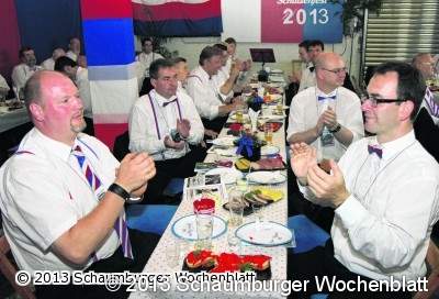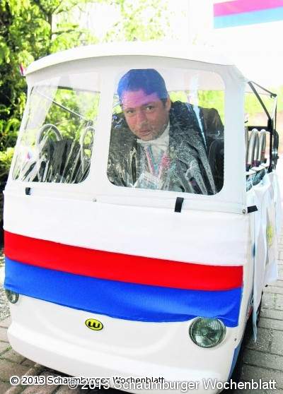 Das Manöver beschwor keine Unfallgefahr herauf und brachte auch keinen Abgasschwall in die eng besetzte Garage. Es handelte sich um einen rund einen Meter hohen Miniatur-Bus, in den sich Rodenbeck gezwängt hatte. Das kleine Gefährt war liebevoll mit Fahnen geschmückt. Und werde von einer "Esel-Stärke" angetrieben, wie die Rottbrüder scherzten. Christoph Jäger, Rottmeister des Vorjahres, hatte den Bus mit seinem Nachfolger in die Halle geschoben.