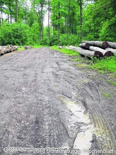 Auch der Lauenauer Revierförster Ralph Weidner zeigt sich besorgt: "Das gefällt uns auch nicht", blickt er auf fällige Reparaturen. Soeben sind die erforderlichen Maßnahmen besprochen worden. Besonders schlimm ist es für Weidner derzeit am Seelzer-Thurmer-Weg sowie auf dem von dort zur Lauenauer Allee führenden Jägerweg. Dort müssten größere Schadstellen mit Mineralgemisch und Walze repariert werden. Dagegen genüge auf weiten Teilen des bei Ausflüglern besonders beliebten Schulzeweges der Einsatz eines Gräders, der die Unebenheiten planiert. Allerdings erfolgen die Reparaturen erst nach dem Abschluss der Holztransporte. Überall lagern derzeit noch an den Wegrändern Stämme, die für die Abholung bestimmt sind. Dagegen hat die Forst die noch fälligen Rücke-Arbeiten in den Waldbezirken schon Anfang Mai eingestellt. "Wir schimpfen uns schon selbst an", berichtet Weidner in diesem Zusammenhang. Denn in den aufgeweichten Schneisen hinterließen Harvester und andere Fahrzeuge tiefe Spuren. Um Boden und Vegetation nicht noch mehr zu gefährden, bleiben etliche Stämme jetzt im Dickicht liegen. Allein in Weidners Revier handelt es sich dabei um 2000 Festmeter Stammholz: "Da freuen sich jetzt die Schädlinge."