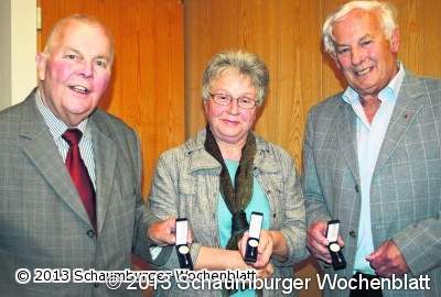 Seit fast 40 Jahren ist Erika Socher Frauenwartin beim VfL Stadthagen. "Mit ihrer Lebensfreude und freundlichen Art, gelingt es ihr immer wieder gleichgesinnte Mitstreiter zu finden und sie zum Mitmachen zu bewegen", zitierte Hellmann den VfL-Vorstandsvorsitzenden Rüdiger Scheibe. Selbstständig organisiert die 73-Jährige für die VfL-Mitglieder Veranstaltungen jeglicher Art – von der Theaterfahrt bis zum Kniffel-Abend. Von 1992 bis 1998 war er Ortsbrandmeister der Ortsfeuerwehr Stadthagen. Feuerwehrkamerad ist er bereits seit stolzen 60 Jahren: Adolf Tatje ist in der Kreisstadt eine Institution. Als Stadtarchivar der Stadt Stadthagen sitzt er noch heute engagiert am Schreibtisch und kümmert sich um die Digitalisierung der Archivalien und Restaurierung des Walkiefers am Alten Rathaus. Fußball ist sein Leben: Rudolf Seiger hat sich wie kein anderer für die Belange des Jugendfußballs eingesetzt. Seit 65 Jahren ist er Mitglied des TSV Eintracht Bückeberge. War lange selbst beim TSV Eintracht Wendthagen aktiv und war von 1950 bis 1986 Jugendtrainer beziehungsweise Jugendleiter des Vereines. "Insgesamt 56 Jahre hat Rudolf Seiger an vorderster Front mitgearbeitet", hält Hellmann fest. Im Dezember 2009 bekam Seiger das Bundesverdienstkreuz für seine fast 60-Jährige Tätigkeit im Jugendsportbereich. Heute ist er Vorsitzender des Förderkreises Jugendfußball.