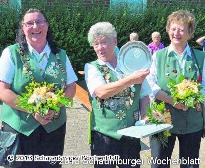 War das allererste Schützenfest noch eine Domäne der Schützen, so haben sich die Schützendamen längst ihren festen Platz im Vereinsgeschehen erobert. Das Schützenfest bot ihnen Gelegenheit, das 60-jährige Bestehen ihrer Damenabteilung im Verein zu begehen, selbstverständlich, wie seit vielen Jahrzehnten Brauch, mit einer eigenen Schützenkönigin. Gerda Fels, ebenfalls mit einer Amtskette ausgestattet, erhielt aus der Hand des Vereinsvorsitzenden einen Zinnteller als Anerkennung ihrer Königswürde überreicht. Für Jugendkönig Sascha Knaack-Schwartz hatte Hoffmeister ein Präsent mitgebracht.