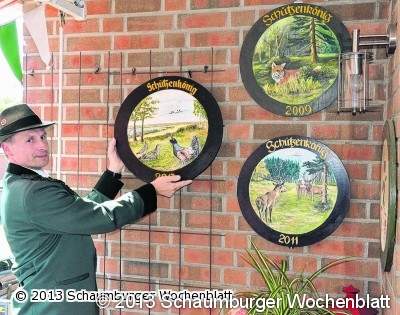85 Jahre später trägt der amtierende Bad Nenndorfer Schützenkönig ebenfalls schwer an seiner offiziellen Amtskette. An der Seite des Vereinsvorsitzenden Wolfgang Hoffmeister schritt König Karl-Heinz Richter zu den Klängen des Präsentiermarsches die Front seiner Kameradinnen und Kameraden ab. Diese hatten sich ihm zu Ehren in Reih‘ und Glied aufgestellt. Steffen Köcher, Geräte- und Waffenwart des Vereins, machte sich derweil auf den Weg nach oben, um die mittlerweile vierte Königsscheibe auf dem Balkon des schießsportlich sehr erfolgreichen Königs zu befestigen. Dieser gehört dem Verein seit 1967 an, wie eine Kopie seines Aufnahmeantrags auswies, die Wolfgang Hoffmeister dem strahlenden König überreichte.