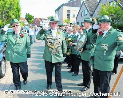 BAD NENNDORF (bt). Die in blau – weiß gekleideten Spielleute des Musikzugs Pohle vorweg, die 22 in grün – weiß gewandeten Bad Nenndorfer Schützendamen und Schützen dahinter – so näherte sich der Tross zu den Klängen flotter Marschmusik dem Heim von Schützenkönigin Gerda Fels und Schützenkönig Karl-Heinz Richter.