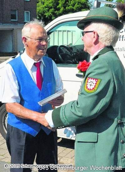 Wolfgang Hoffmeister, Vorsitzender der Bad Nenndorfer Schützen, bedankte sich bei Heinz Voss für dessen Treue zum hiesigen Schützenfest und überreichte ein Präsent. Kapelle und Schützen stimmten gemeinsam zu Ehren des Jubilars ein "Hoch soll er leben an".
