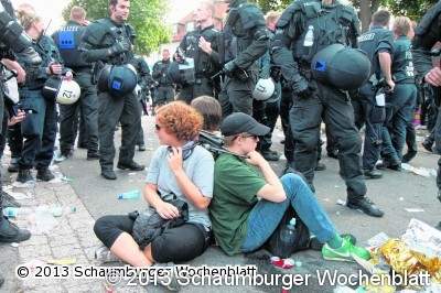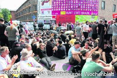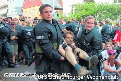 Gegen 19 Uhr war es den Polizisten gelungen, fast alle Gegendemonstranten vom Platz zu tragen, mit Ausnahme der in der Pyramide und mit Bügelschlössern Festgeketteten. Zwar glückte es den Beamten, die Bügelschlösser nach einiger Zeit mit gebührender Vorsicht auf zu fräsen. Die in der Pyramide mit den Fingern festgeketteten Aktivisten lösten sich jedoch erst freiwillig aus der Befestigung, als sich die Rechtsextremen auf dem Rückmarsch zum Bahnhof befanden. Zwischen 19 Uhr und 20 Uhr verließen auch die meisten Gegendemonstranten Bad Nenndorf, so dass gegen 20 Uhr auch die ersten Polizeieinheiten abrücken konnten.Foto: bb