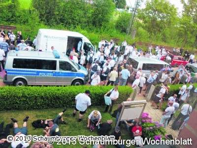 Über 60 Rechtsradikale sammelten sich zeitweise auf dem Grundstück. Dort harrten die Demonstranten für zwei Stunden aus, auch auf die Weisung hin, den Garten zu verlassen. Banner, Flaggen, Tattoos und ihre Kleidung wiesen die Demonstranten deutlich der Zugehörigkeit der Rechten Szene aus. "Unter den Rechtsradikalen waren auch einige bedrohliche Typen", so die Anwohner. Die Rechten fotografierten zudem die Hausbewohner, darunter Kinder. "Für uns war das sehr unangenehm und bedrohlich", erklärten die eingeschüchterten Hausbewohner.