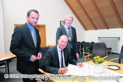 STADTHAGEN (mh). Das Goldene Buch der Stadt Stadthagen ist um eine Eintragung reicher: "Ich bin tief beeindruckt von dem Engagement der Bürgerschaft von Stadthagen, die ehemalige Synagoge wieder zum Leben zu erwecken", mit diesen Worten hat sich der SPD-Bundestagsabgeordnete Wolfgang Tiefensee in einer kleinen Feierstunde im Ratssaal in das Goldene Buch eingetragen. Insbesondere in seiner Funktion als Vorsitzender der Vereinigung "Gegen Vergessen – Für Demokratie" zeigte Wolfgang Tiefensee großes Interesse an der Arbeit des "Fördervereins ehemalige Synagoge Stadthagen". Der Vorstand des Vereins gab einen Überblick über die Arbeit, über die geplanten Aktivitäten und über die Nöte und Probleme, mit denen er zu kämpfen hat.