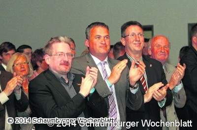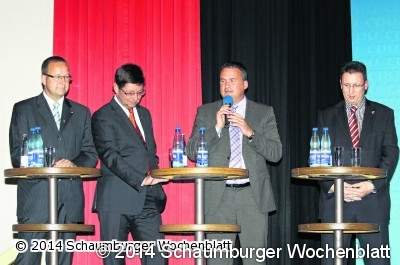 Rückenwind im Wahlkampf gab es auf der Veranstaltung für die Schaumburger CDU-Bürgermeister-Kandidaten Heiko Tadge für Stadthagen, Friedrich-Wilhelm Rauch für Rinteln, Mike Schmidt für Nenndorf sowie den parteilosen von der CDU unterstützten Georg Hudalla für Rodenberg. Sie stellten sich vor dem Auftritt Schäubles in einem Kommunaltalk vor. Foto: bb