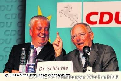 STADTHAGEN/LANDKREIS (bb). Es war ein Auftritt unter den Vorzeichen des Wahlkampfes zur Europa- und Bürgermeisterwahl, den der Finanzminister Wolfgang Schäuble (CDU) in der Festhalle Stadthagen zur Unterstützung der Schaumburger Christdemokraten absolvierte. In seiner Rede warb Schäuble um Stimmen für die CDU und gleichzeitig mit großer Leidenschaft für die Idee der europäischen Einigung.