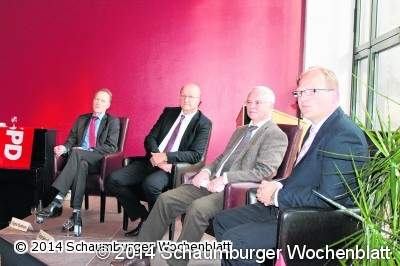 01: Diskutieren über Geld: (v.li.) Sigmar Sandmann, Bürgermeisterkandidat Samtgemeinde Nenndorf, Landtagsmitglied Karsten Becker, Finanzminister Peter-Jürgen Schneider und Sven Janisch, Kandidat für Rodenberg.