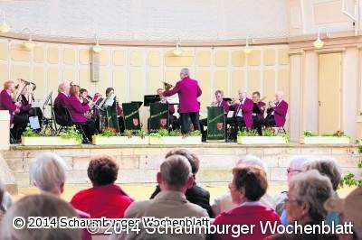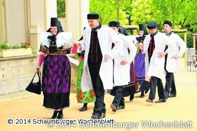 Die Musiker eröffneten das Freikonzert mit einem launigen Marsch und als würde dieser sie geradezu animieren, fanden immer mehr Gäste, ob mit Wanderstöcken oder Kinderwagen, den Weg auf die Esplanade. Manch einer genoss die musikalische Unterhaltung aber auch gemütlich auf einer Bank liegend und der Sonne entgegengestreckt von der Kurpromenade aus. Andere wiederum ließen sich sogar zu einer spontanen Tanzeinlage hinreißen, als das Blasorchester den Walzer "Schöne Erinnerung" spielte – passend zu der Veranstaltung auf der in ihren Ursprungszustand versetzten neu gestalteten Esplanade, wie das Orchester verlauten ließ. Und dann war es soweit: Je vier Damen und Herren schwangen die farbenfrohen Schaumburger Trachten über das Pflaster. "Das sieht ja Hammer aus", kommentierte eine Besucherin. Zwischen dem "Windmühlenflügel" und "Marientanz" versorgte ein Sprecher aus den Reihen des Blasorchesters die Besucher mit Informationen rund um die präsentierte Schaumburger Tracht, "einer der schönsten Trachten in Deutschland". Er erklärte das bunte Farbenspiel etwa bei der Österten-Frauentracht wie sie im Bereich von Stadthagen bis nach Bad Nenndorf getragen wurde: vom charakteristischen roten Rock mit Saumband über die ausgestickte Seidenschürze bis hin zur "Punzmüsse" als Kopfbe-deckung. Foto: jl
