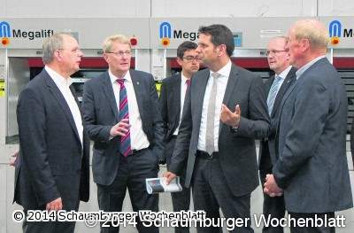 LANDKREIS/STADTHAGEN (bb). Der niedersächsische Wirtschaftsminister Olaf Lies (SPD) hat gemeinsam mit dem Landtagsabgeordneten Karsten Becker, Landrat Jorg Farr und Bürgermeister Bernd Hellmann den Stadthäger Standort von Heye International besucht. Dirk Pörtner, Geschäftsführer des Unternehmens, gab vor dem Rundgang einen Überblick über die Tätigkeit des Herstellers von Maschinen für die Glasbehälter-Industrie.