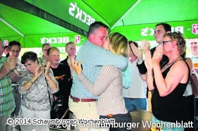 Erst küsst er seine Ehefrau Verena, dann springt er auf. Das minutenlange Händeschütteln, Umarmen und Gratulieren nimmt seinen Lauf, die Menge feiert ihn singend. "Ich war zwar immer optimistisch, aber der Meinung, dass es knapp werden könnte", erzählt Schmidt im Freudentaumel. Dass er mit einem so deutlichen Vorsprung gewonnen hat, überwältige ihn.