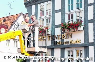 STADTHAGEN (bb). Im Zuge der Initiative "Stadthagen blüht auf" haben Günter Raabe vom Stadtmarketingverein Stadthagen (SMS) und Dieter Kellermeier vom Gartenbauverein Blumenkästen am "Haus zum Wolf" angebracht. Mit den blühenden Pflanzen sollen zusätzliche Farbtupfer an den Innenstadtfassaden gesetzt werden. Kellermeier und Raabe brachten die Kästen im Rahmen der Initiative "Stadthagen blüht auf" an. Mehrere Partner haben sich in ihr zusammengeschlossen, um die Innenstadt mit Pflanzen zu verschönern.