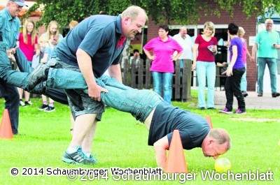 Das Team von "Glück-Auf Riehe" stellte eine Übung an den Beginn des Wettkampfes, die es in sich hatte. Als "Schubkarren-Tandem" war ein Slalom-Parcours zu absolvieren. Ein Teilnehmer hielt dabei die Beine seines Mannschaftskameraden in die Höhe, während dieser auf den Händen vorwärtsschritt. Dazu galt es für den auf Händen vorangehenden, einen Ball mit dem Kopf durch die Pylone zu rollen. Eine Übung, die jeweils beide Teile des Duos erheblich forderte. Trotz schmerzender Arm-, Bauch- und Rücken-Muskulatur hängten sich alle Teams kräftig rein, um sich nicht von ihren Kontrahenten abhängen lassen. Anschließend bliebt beim Lasso-Werfen etwas Zeit zum Durchschnaufen. Hier kam es mehr auf Konzentration und Zielgenauigkeit als auf Kraft und Durchalte-Vermögen an. Für viel Freude auch unter den Zuschauern sorgte der Schwimmflossenlauf, bei dem gleichzeitig ein Ei auf einem Löffel zu balancieren war. Die Eimerspiele werden jeweils im Wechsel von "Glück-Auf Riehe", der Feuerwehr und dem TuS Riehe organisiert. Oft variieren die Ausrichter die Veranstaltung durch neue Disziplinen.Foto: bb