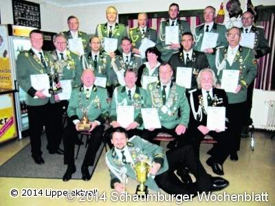 Die Ergebnisse: Bei den Vorsitzenden sicherte sich Heinz Holey (SG Detmold) mit 101.3 Zählern vor Kay Schildmann (Rischenau) mit 101 Zählern und Ralf-Reiner Kehne (SG Horn) mit 97.4 Zählern den Pokal. Im Wettbewerb der Oberst-Ajutanten hatte Hans Patzk (SG Horn) mit 100.7 Zählern die Nase vorn vor Gerhardt Plogster (Großenmarpe) 99,5 Zählern und Stefan Reckemeyer (Rischenau) mit 97,7 Zählern. Der Vierte, Manuel Bextermöller (SG Belle) 95.6 Zähler, muss nach den dreimaligen Erfolgen der Detmold Heinz Holey nun den Wettbewerb 2015 ausrichten.