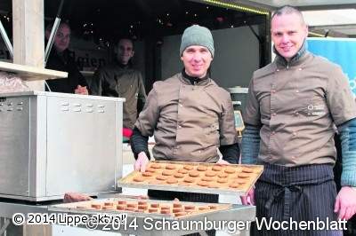 Wie schon bei der Premiere im vergangenen Jahr präsentierte sich Detmolds Partnerstadt an drei Tagen auf dem Weihnachtsmarkt und wurde dabei in diesem Jahr von vier Schülern der Hasselter Hotelschule ganz praktisch unterstützt: Die Hasselter Spekulatius wurden direkt vor Ort an der Hütte frisch gebacken und der würzige Duft verführte sofort zum Naschen.