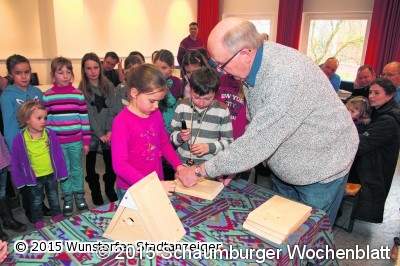 HAGENBURG (g). Die Leiterin der Jungschar der evangelischen Kirche Altenhagen-Hagenburg, Dörthe Hofheinz, kam auf die Idee eines Nistkasten-Workshops. Fachkundig unterstützt wurde sie dabei von Fritz Büsselberg, der seine Mitarbeit gern zusagte. Büsselberg bereitete die Vogelkästen vor, die Kinder sollten sie zusammenbauen. Um es einfacher zu machen, war es ein kompletter Bausatz für ein dreieckiges Vogelhaus einschließlich vorgebohrter Löcher und Schrauben. Im Gemeindehaus trafen sich rund 40 Väter und Mütter mit ihren Kindern und dem entsprechenden Werkzeug. Nach einer kurzen Anleitung von Büsselberg ging es dann an die Arbeit. Die Kinder nahmen ihren selbst gebauten Nistkasten natürlich mit nach Hause. Nun können Höhlenbrüter wie Spatzen oder Meisen ungestört für Nachwuchs sorgen. Foto: gi