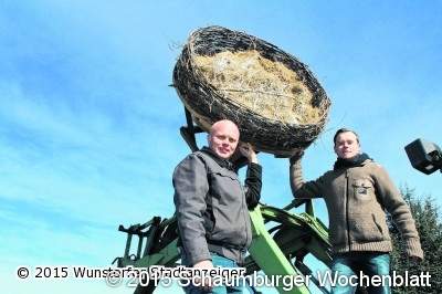 Die wurde unkompliziert gefunden, denn die Sonnenburg – ein psychiatrisches Wohn- und Pflegeheim in Münchehagen – erklärte sich zur Hilfe bereit. In der Ergotherapie dort entstand ein großes Nest mit einer Plattform aus massivem Buchenholz, einem Weidengeflecht am Rand und einer ersten Polsterung aus Heu. "Außerdem", sagt Michael Graue, der als Tischler in der Sonnenburg für den Bau verantwortlich war, "haben wir weiße Kleckse in das Nest gesetzt – das soll den Störchen signalisieren, dass sie hier nisten können."