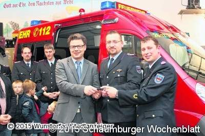 Die Anschaffung ist von vielen Firmen unterstützt worden – wer dazu gehört, konnten alle Anwesenden bei der Fahrzeugübergabe auf einem Transparent lesen. Beteiligt hat sich auch die Jagdgenossenschaft Münchehagen – und ein maßgeblicher Spender ist der Spielclub der Freiwilligen Feuerwehr des Ortes, deren Vorsitzender Matthias Dreyer gemeinsam mit dem Vorsitzenden des Rehburg-Loccumer Feuerwehr-Fördervereins, Andreas Wulf, den Schlüssel für das Fahrzeug an den Bürgermeister übergab – der ihn umgehend an die Feuerwehr weiterreichte.