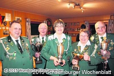 DEDENSEN (gi). Die Schützengilde proklamierte im Schützenhaus ihre Könige. Auf die Königsscheiben haben 14 Schützinnen und Schützen geschossen, der Schützenkönig heißt Armin Tannigel. Leider konnte er die Glückwünsche und die Königskette nicht persönlich entgegen nehmen. Tannigel hatte vor einem Jahr den Besuch eines Musicals in Hamburg gebucht, der Termin fiel ausgerechnet auf den Tag der Königsproklamation. Angenagelt wird die Königsscheibe am 30. Mai. "Es waren sehr gute Schießergebnisse", sagte Schießsportleiter Heiko Junge. Minikönigin wurde Annika Hampe mit einem 185,4 Einzelteiler. Seinen Titel aus dem Vorjahr verteidigte Jugendkönig Florian Mattich. Geehrt wurden auch die Gewinner der Pokale und der Jubiläumskette. Den Damenpokal gewann Angelika Tscherniawski mit 140 Ringen, den Möbiuspokal Heiko Junge mit einem 217,7 Doppelteiler, den Wilhelm-Pokal Nicole Wollgien mit 742 Ringen und den Ament-Pokal Frank Mattich mit 342 Ringen (Martina Nimmich kam auf 341 Ringe). Die Jubiläumskette holte sich Frank Mattich mit einem 536,3 Dreiteiler. Foto: gi