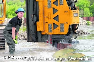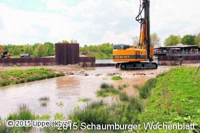 "Drei Jahre lang haben die Bauarbeiten gedauert. Dass wir nun kurz vor der Vollendung stehen, ist für alle Beteiligten etwas Besonderes", betonte Heuwinkel. Bisher war die zukünftige Umflut komplett von der Emmer abgeriegelt, um die nötigen Bauarbeiten im Trockenen ausführen zu können. Nachdem nun die Gestaltung des neuen Flussbettes abgeschlossen ist, kann das Wasser durch die Baustelle fließen. Damit bei den nun noch anstehenden Arbeiten der See jedoch nicht komplett leer läuft, muss der letzte Bauabschnitt phasenweise durchgeführt werden. Dazu wird die sogenannte Querspundwand, die bisher die Emmer von der Umflut trennt, um 1.50 Meter nach unten gedrückt. Ein Teil der Emmer kann so über die Spundwand in die Umflut fließen. Gleichzeitig wird es möglich, auf Höhe der Seeterrassen den Bau des Damms zu vollenden, der zukünftig den Schiedersee von der Emmer abtrennen wird. Hierzu wird von der Baustraße, die in den vergangenen Tagen im See aufgeschüttet wurde, die Stahlspundwand als Dichtungselement in den Boden gedrückt und anschließend mit einer Steinschüttung angefüllt. "Diese Arbeiten werden noch ungefähr drei Wochen in Anspruch nehmen, erst dann ist der Bau der Umflut endgültig abgeschlossen", sagen die der Geschäftsführer des Erholungszentrum Schieder, August Tölle und Berthold Lockstedt vom Fachbereich Umwelt und Energie des Kreises Lippe. Am 10. Juni wird die Umflut offiziell durch Johannes Remmel, Minister für Klimaschutz, Umwelt, Landwirtschaft, Natur- und Verbraucherschutz des Landes NRW, und Landrat Friedel Heuwinkel eröffnet. Herzu werden auch die Bürger eingeladen.