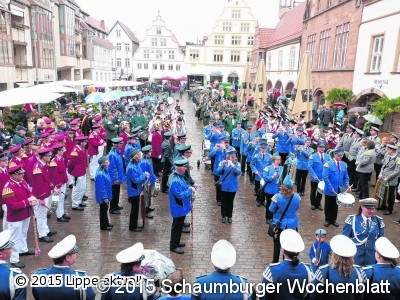 Die Geburtsstunde des Spielmannszuges war der 18. August 1950. Als am 25. April 1976 das Schützenhaus abbrannte, wurden weit mehr als die Hälfte der Instrumente und Uniformen, die im Schützenhaus lagerten, vernichtet. Dank vieler Spenden konnte man jedoch weitermachen. 1978 gelang es, gemeinsam mit der Stadt Lemgo, ein neues (gepachtetes) Haus zu finden, welches in 400 Stunden Eigenleistung renoviert wurde. Ab 1978 nahm "Blau-Weiß" wieder am lippischen Wettstreit der Spielmannszüge teil. In diesem Jahr klappte es noch nicht so ganz, doch schon 1980 wurde der 1. Platz und damit der Aufstieg in die A-Gruppe erspielt. Auch bei den Solisten und Stabsführern gab es mehrere Platzierungen. Derzeit gibt es beim Spielmannszug Blau-Weiß 24 aktive Musikerinnen und Musiker. Im Sternmarsch zogen die 17 Gruppen mit mehr als 300 Mitwirkenden durch die Innenstadt, um sich dann auf dem Marktplatz zu einem Festakt zu versammeln. Dort spielten alle Kapellen zum Abschluss gemeinsam, wobei der "Steinerne Saal" Lemgos von Pauken und Trompeten, sowie Fanfaren und Flöten widerhallte und das harmonische Zusammenspiel bei einigen Anwesenden ein Gänsehautgefühl hervorrief. Anschließend ging es geschlossen zum Regenstorplatz wo bei Kaffee, Kuchen, Speisen und Getränken ein Bühnenspiel aller Vereine stattfand und dann im Vereinsheim bei Musik und Tanz weitergefeiert wurde. 17 Gruppierungen, davon 13 Spielmannszüge, marschierten nach und nach im "Steinernen Saal" ein. Foto: Babakhan