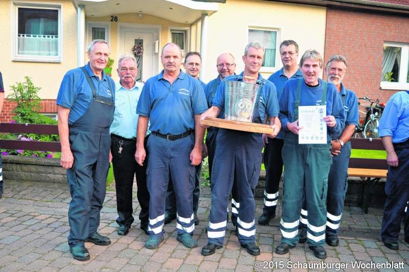 MESMERODE (gi). Jedes Jahr am letzten Freitag im August und bereits zum dritten Mal fanden die "Eimerfestspiele" nach Heimberg Fuchs vor dem Gerätehaus Mesmerode auf der eigens dafür teilgesperrten Straße Auf der Worth statt. Es geht nicht allein um Schnelligkeit und das Geschick am Strahlrohr, es müssen drei Eimer umgespritzt werden. Auch das Alter spielt eine nicht unerhebliche Rolle, die Übung ist aber möglichst fehlerfrei durchzuführen. Fünf Altersgruppen aus dem Stadtgebiet machten mit, leider nur halb so viele wie die Jahre zuvor. Dies habe dem Wettbewerb jedoch nicht geschadet, der begehrte Wanderpokal in Form eines Eimers war trotz allem hart aber fair umkämpft. Schlussendlich reichten vier Punkte Vorsprung für den Sieg. Den holte sich die Ortsfeuerwehr Mesmerode mit 428 Punkten. Es folgen die Ortswehren aus Bokeloh (424 Punkte), Idensen (3875 Punkte), Großenheidorn (359 Punkte) und Wunstorf (356 Punkte). Zu Beginn der Siegerehrung überreichte Ortsbrandmeister Carsten Gärtner den Ablösepokal an den Vorjahressieger aus Bokeloh. Mit leeren Händen ist keine der angetretenen Ortswehren nach Hause gefahren, den obligatorischen Mettwurst-Preis und eine Urkunde nahm jeder mit. Das Wettkampfgericht wurde vom ehemaligen Stadtbrandmeister Albrecht Meyer geleitet, Thorsten Mues kümmerte sich um die Auswertung sowie die Gestaltung der Urkunden, zahlreiche Kameraden aus Mesmerode halfen mit. Foto: privat