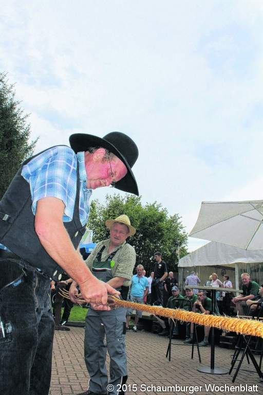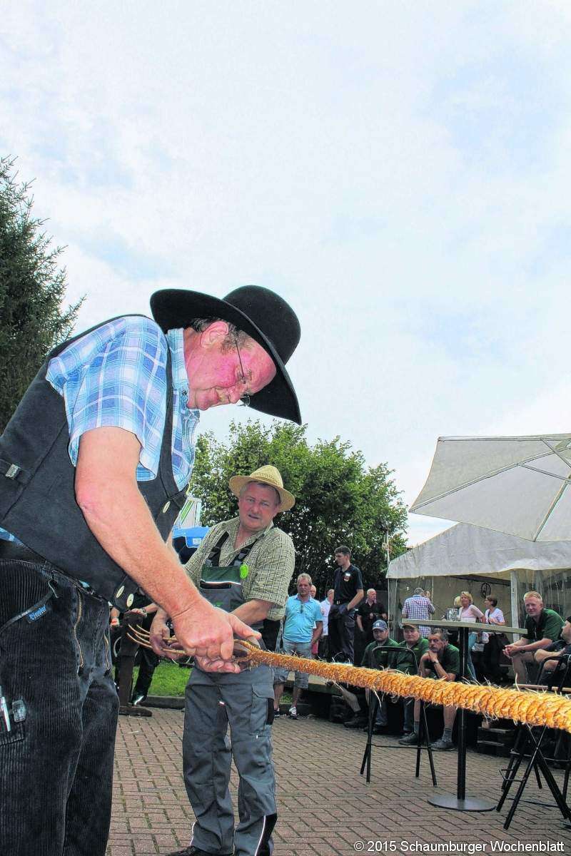 "Da kommen noch zwei Schlepper. Wo stellen wir die denn hin?" Einen genaueren Blick musste Daniel Lindenberg schon in die Runde werfen, um diese Frage beantworten zu können. Der Platz wurde eng auf dem Gelände an der Grundschule in Münchehagen – und damit hatte der Leiter der Oldtimer-Sparte des Mönkehäger Dörpvereins gar nicht mehr so wirklich gerechnet, als er am frühen Morgen aus dem Fenster schaute. Wer von den Treckerfreunden aus näherer und weiterer Umgebung sich bei heftigem Gewitter auf den Weg machen wollte, war da die bange Frage. Die Sorge war also unbegründet, wie sich wenig später herausstellte. Aus allen Richtungen tuckerte es zur Anfahrt in Münchehagen und gegen Mittag waren bereits 160 Fahrzeuge angekommen. "Man muss den Leuten schon etwas bieten", sagte Lindenberg mit Blick auf die Aktionen, die Dörpverein und Feuerwehr des Ortes rund um die Oldtimer geplant hatten. An einer Stelle wurden Seile nach alter Manier gedreht, eine "Kuh" lud ein, gemolken zu werden, auf dem hinteren Parkplatz arbeitete ein Holzschnitzer so kräftig, dass die Späne flogen, und aus einem Zelt zogen verlockende Düfte von Kartoffelpuffern. Die Sache mit den Kartoffeln war unterdessen das Einzige, was an diesem Tag wegen des anfänglichen starken Regens nicht funktionierte. Auf einem benachbarten Feld, so hatte es der Dörpverein geplant, sollte gezeigt werden, wie früher Kartoffeln geerntet wurden. Allerhand Gerätschaften hatte der Verein zusammen getragen und sich auch aussortierte Kartoffeln in größerer Menge besorgt, die morgens eingebuddelt werden sollten, um später wieder zum Vorschein zu kommen. "Das Feld mussten wir aber komplett sperren", sagte Lindenberg voller Bedauern – viel zu nass war es dort. Das ebenfalls geplante Mähen von Korn fiel ebenso ins Wasser, lediglich die Dreschvorführungen konnten stattfinden. Das Korn, das gedroschen werden sollte, hatte die Nacht zuvor trocken in einer Scheune verbracht. Dem Besucherstrom – neben den Oldtimer-Fahrern kamen auch viele andere Schaulustige – tat das keinen Abbruch. Alte landwirtschaftliche Maschinen haben nach wie vor nichts von ihrer Faszination verloren. Foto: jan