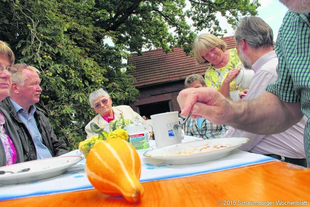 100 Plätze seien es wohl, sagt Jürgen Rust, die sie im Garten und im Haus vorbereitet hätten. Unter und neben den alten Kastanien auf dem Hof stehen Tische und Bänke. Ein ums andere Mal lässt sich dort eine neue Gruppe nieder, mit üppigen Torten auf den Tellern vor sich und im Gespräch mit Nachbarn, Freunden und Bekannten. Man trifft sich bei Rust an diesem Wochenende. Das ist zur beginnenden Herbstzeit seit 15 Jahren so gewesen, das gehört für viele einfach zum Jahresablauf dazu. Doch damit soll es nun vorbei sein. Das große Kürbisfeld neben dem Haus wollen Christel und Jürgen Rust nicht noch einmal bestücken, wollen nicht noch einen Kürbismarkt anbieten. Ein Hobby ist es die ganzen Jahre gewesen, nun soll es damit gut sein. Ein bisschen Wehmut schwingt schon mit, als Jürgen Rust mit etlichen Loccumern an einem Tisch sitzt und erzählt. Von den vielen Festen und den vielen Menschen, die immer zu ihnen gekommen sind. Andererseits, räumt er aber auch ein, habe er sich gefragt, was er allein in den vergangenen vier Wochen alles verpasst habe. Wo konnte er nicht hingehen, wo nicht dabei sein, nur weil die Kürbisse darauf warteten, geerntet zu werden, der Hof auf Hochglanz gebracht werden sollte, weil die vielen, vielen kleinen Dingen zur Vorbereitung des Festes zu tun waren. Für das kommende Jahr haben er und seine Frau schon einige Pläne, wie sie die Zeit, die sie dann zur Verfügung haben, schön verbringen können. Zum letzten dieser Feste sind noch einmal viele gekommen, um sich davon zu verabschieden – und natürlich auch, um Kürbisse mitzunehmen: solche, die zur Suppe taugen, solche, die gruselig zurecht geschnitzt vor den Türen landen, Zierkürbisse, Kalebassen und viele andere mehr. An einem Tag im beginnenden Herbst 2016 werden sie sich etwas anderes vornehmen müssen – Christel und Jürgen Rust sind dann anderweitig unterwegs.Foto: jan