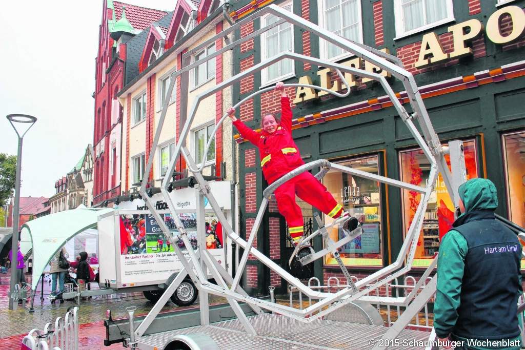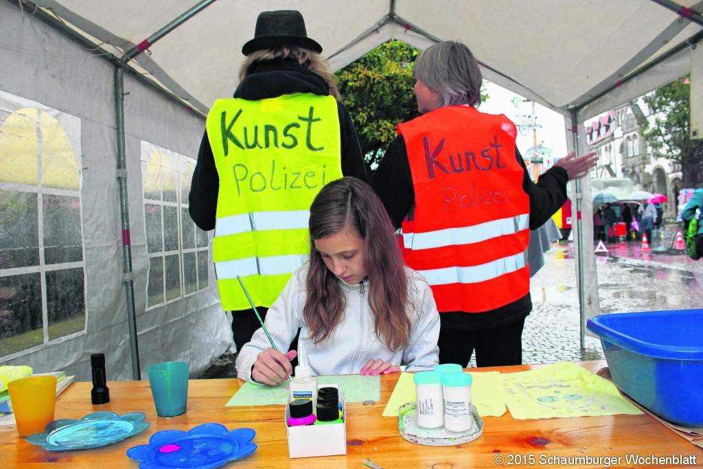 Motiviert und voller Optimismus bauten die Vereine und Institutionen ihre Stände auf und boten den wenigen Besuchern einen Einblick und kreative Ideen. Am Stand der Kunstschule konnten Kinder, aber auch Erwachsene zum Beispiel mit fluoreszierenden Farben malen, die in einer selbstgebauten Dunkelkammer zum Leuchten gebracht wurden. Gleichzeitig sorgte die Kunstpolizei dafür, dass auch jeder, der mochte, sein Recht auf Kreativität wahrnehmen konnte. Das Forum Stadtkirche öffnete den Kirchenturm, lud zu Führungen ein und hielt Ferngläser bereit. Die Chill-Out-Lounge am Stand von "kurze Wege" bot eine gemütliche Rückzugsmöglichkeit und die Stadtsparkasse Wunstorf baute ihr Bungee-Run kurzerhand im Eingangsbereich des Geldhauses auf. Dort sprangen Kinder- und Jugendliche an Gummiseilen befestigt einmal quer durch das Foyer. Den Royal Rangers der K21 machte das schlechte Wetter fast nichts aus. Am Lagerfeuer mit einem Ranger-Tschai-Tee war es für alle Besucher und Mitarbeiter gemütlich warm. Am Stand des Stadtjugendringes gab es für frierende Gemüter einen heißen Kaffee. Ehrenamtliche Mitarbeiter nutzten die Gelegenheit mit anderen Vereinen ins Gespräch zu kommen und deren Aktionsstände kennen zu lernen. Die heiße Bratwurst und ein heißer Kaffee hielten alle bei guter Laune, obwohl das Bühnenprogramm aufgrund der Witterung nicht stattfinden konnte. Foto: tau