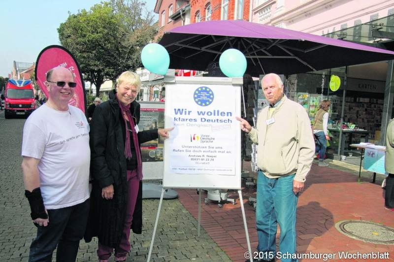 WUNSTORF (gi). Der Verein deutsche Sprache (VdS) präsentierte sich erstmals nach 2012 in der Fußgängerzone vor der Buchhandlung Weber wieder mit einem Infostand zum Tag der deutschen Sprache. Regionalleiter der Region 31, der Wunstorfer Andreas R. Niepel freute sich über das große Interesse und auch den Besuch des VdS-Vorsitzenden Professor Dr. Walter Krämer aus Steinhude. Angesprochen wurden die Besucher, das Schrottwort des Jahres 2015 zu wählen. "Wie auch die letzten Jahre hat ‚X-Mas‘ mit 17,3 Prozent den größten Ekelfaktor zugesprochen bekommen, dicht gefolgt von ‚Shit storm‘, ‚No-go-area‘ und ‚Bashing‘", sagte Niepel. "Der VdS rät daher dem Einzelhandel, zur Weihnachtszeit bei Angeboten auf den Begriff X-Mas zu verzichten, weil sich zahlreiche Kunden davon abgestoßen fühlen. Gestützt wird dies auf eine Erhebung zum Tag der deutschen Sprache. Der Einzelhandel sollte lieber deutsche Begriffe verwenden und somit die Sprache seiner meisten Kunden sprechen und schreiben", schlägt Niepel vor. Der VdS war auch beim Tag der Niedersachsen im Juni in Hildesheim vertreten. Passanten wurden aufgefordert, einen Lesetest zu absolvieren, zu raten, welche Art von Geschäft sich hinter zum Teil sinnfreien Namen verbirgt und zu raten, was einige ausgesuchte Anglizismen. Auch sollten drei Schrottworte des Jahres aus einer Vorschlagsliste mit 23 Begriffen angekreuzt werden. Eine Auswertung ergab, die meisten wollen zu Weichnachten kein "X-Mas" sehen und nichts von "No-go-areas" hören und lehnen die Begriffe "Bashing" und "Shit storm" ab. Die Teilnahme bezeichnete Regionalleiter Andreas R. Niepel als einen Erfolg für den VdS. Foto: gi