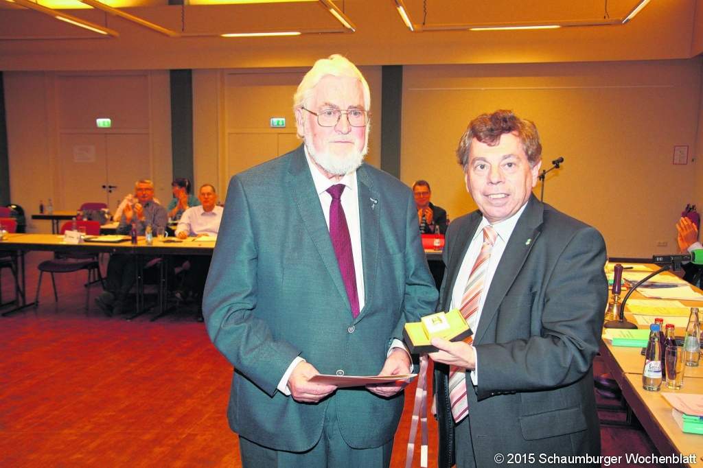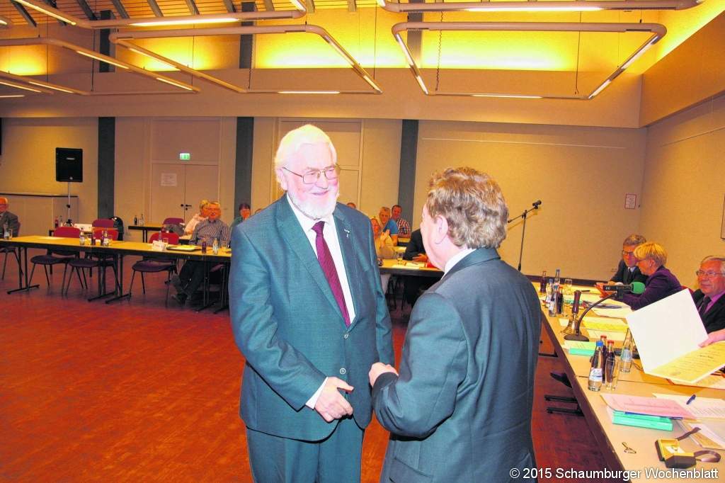 WUNSTORF (gi). Beifall im Rat der Stadt für einen verdienten Kommunalpolitiker. Bürgermeister Rolf-Axel Eberhardt verlieh in der Sitzung am Mittwoch Siegfried Kröning den Goldenen Ehrenring der Stadt. Der wird nach dem Ende einer mindestens 20-jährigen kommunalen Tätigkeit verliehen. Und die hat Kröning bei weitem erfüllt. Er kam als Nachrücker von Sigrid Rehkopf 1983 in den Ortsrat Wunstorf, am 9. September 2015 schied er auf eigenen Wunsch (wir berichteten) aus. Kröning war von 2001 bis 2011 stellvertretender Ortsbürgermeister, Mitglied im Schützenfestkomitee und 1986/87 Vorsitzender des Gremiums zur "Beobachtung des Fahrradverkehrs in der Fußgängerzone" (das Ergebnis daraus hätte Eberhardt gerne gewusst). Große Verdienste erwarb sich Kröning im kulturellen Bereich, er wird auch als "Kulturpabst" bezeichnet. Seit 37 Jahren ist er Vorsitzender des Kulturrings. Eberhardt dankte Kröning für seine engagierte ehrenamtliche Arbeit. Schmunzelnd fragte er den FDP-Politiker, ob er den Ring links oder rechts angesteckt haben möchte. "Es ist eine Ehre für mich, ich werde den Ring in Ehren halten", sagte Kröning. Im Jahr 1968 haben er und seine Frau entschieden, Wunstorf als seinen Dienst- und Lebens-ort auszuwählen. Doch war er sehr erschrocken über den starken Lastwagenverkehr, der sich durch die Lange Straße und Nordstraße zog. Kröning bekam seinerzeit einen Stadtplan in die Hand, auf der die Nordumgehung gestrichelt eingezeichnet war. Er ging davon aus, dass der Bau vielleicht in fünf Jahren erledigt sei und zog 1969 nach Wunstorf. Kröning wünscht allen, dass dieser Traum in der geliebten Stadt in Erfüllung gehen möge. Foto: gi