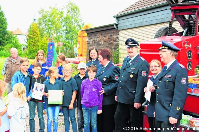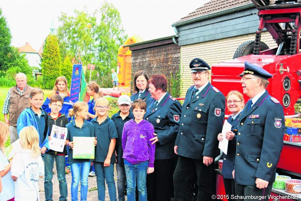Unter Mithilfe der Aktiven und vieler Freunde der Feuerwehr konnten die gut ein Dutzend Mannschaften Wissen und Geschicklichkeit an zehn Stationen unter Beweis stellen. Dafür mussten die Jungen und Mädchen bis zur ehemaligen Waldgaststätte Krackes Ruh und von dort aus zum alten Tanklager der britischen Armee durch die Feldmark wandern. Alle Aufgaben hatten irgendwie mit Wasser und Wehr zu tun. So mussten an einer Station Wörter aus Schläuchen gelegt werden. Bei einer anderen Gelegenheit brachte der Strahl aus Wasserpistolen eine Kerze zum Erlöschen. Zu guter Letzt mussten auch die Betreuer mitmachen: Sie sollten in den übergroßen und mit Wasser gefüllten Gummistiefeln von Ortsbrandmeister Bernd Werhahn einen Slalom bewältigen. Nebenbei wurde hier so mancher Fuß sauber. Zur Siegerehrung berichtete Kreisjugendwartin Silke Weibels, dass sie selbst vor jetzt 32 Jahren als erstes Mädchen in die örtliche Jugendgruppe eingetreten war. Vater Heinz Weibels erinnerte sich daran lebhaft: Zudem war er gleich nach der Gründung Jugendwart gewesen. Bei der Siegerehrung war das Hallo vor allem bei den jungen Gästen aus der Nachbarschaft groß: Die Schmarrier Nachwuchslöscher trugen einen Doppelsieg davon. Sowohl die Jugendwehr wie auch die Kindergruppe belegten den ersten Platz.