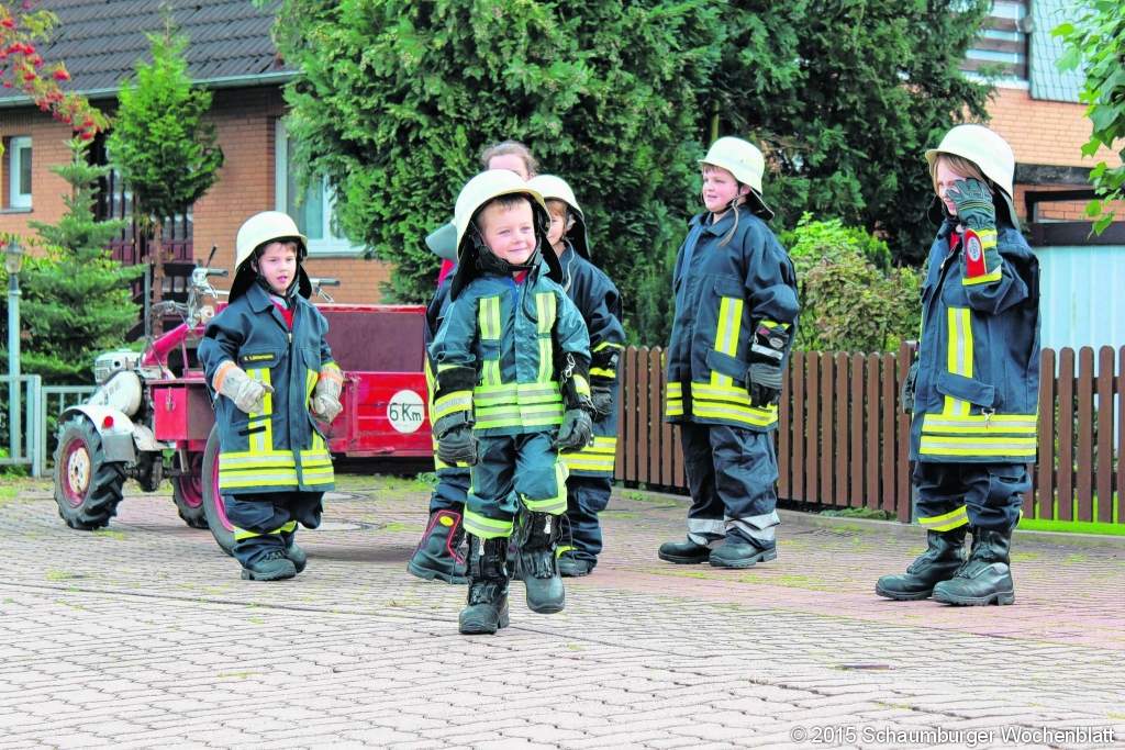 BAD REHBURG (jan). Zehn Jahre Jugendfeuerwehr in Bad Rehburg und ein "Tag der Feuerwehr"– die kleinste Ortsfeuerwehr Rehburg-Loccums hat ein großes Programm für ein Wochenende vorbereitet. Zwischendurch, sagt Ortsbrandmeister Eik Lübkemann, habe es gar nicht gut für die Jugendfeuerwehr ausgesehen. Da war teilweise nicht klar, ob sie mangels Jugendlichen überhaupt noch weiter bestehen könne. Nicht unbedingt verwunderlich ist das in einem kleinen Ort mit lediglich rund 500 Einwohnern. Doch sie haben es dank intensiver Werbung geschafft: zehn Jugendliche sind derzeit dabei, machen aktiv mit, können in dieser Stärke an Wettbewerben teilnehmen und haben offensichtlich auch Spaß an der Sache. Zur Feier ihres zehnjährigen Bestehens hatten sie befreundete Jugendfeuerwehren zu einem Orientierungsmarsch eingeladen. Zehn Gruppen sind gestartet, den Sieg hat Münchehagen davon getragen. Tags darauf kam die Jugendfeuerwehr allerdings noch einmal zum Einsatz, denn innerhalb des umfangreichen Programms mit Vorführungen am Feuerwehrgerätehaus, die von vielen Gästen beobachtet wurden, durften auch sie einen "Löschangriff" demonstrieren. Wurde bei den Jugendlichen das Können mit Applaus quittiert, so gab es beim Auftritt der Kinderfeuerwehr schmunzelnde Gesichter: die jüngste Abteilung der Bad Rehburger Feuerwehr steckte in der Kleidung der Erwachsenen, hatte mit großen Stiefeln und noch größeren Handschuhen zu kämpfen und zeigte trotzdem voller Stolz, wie sie rundum singend marschieren kann und auch im Retten ziemlich groß ist: der Kürzeste unter den Knirpsen, der auf dem Rücken den Schriftzug "Ortsbrandmeister" trug, simulierte einen Sturz mit einem Bobbycar, ließ sich vorbildlich vom Rest der Truppe retten – und zeigte danach ein noch breiteres Grinsen im Gesicht. Foto: jan