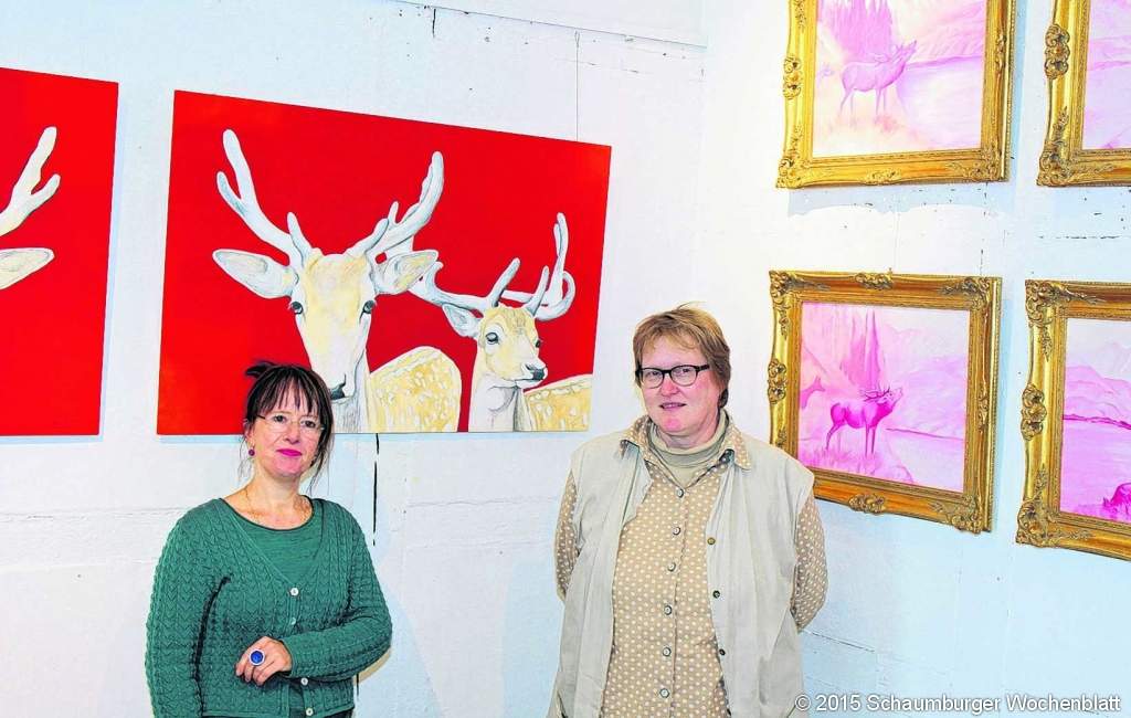 Bad Salzuflen (dib). Das Motiv des röhrenden Hirsches, geschmückt mit Tannen am Hang und Bergsee, stammt aus der akademischen Malerei ab etwa 1880 und ist kein Museumsbild mit hohem künstlerischen Anspruch, sondern ein verstaubter, spießiger und kleinbürgerlicher Zimmerschmuck seiner Zeit, der damals wohl in jeder guten Stube Deutschlands hing. Zwar nicht als Original in Öl, sondern als Reproduktion in hoher Auflage, die für jedermann erschwinglich war. In der heutigen Zeit zählt der "Röhrende" sogar als Inbegriff des Kitsches. Trotzdem haben ihn zwei Künstlerinnen aus Bielefeld aufgegriffen, malerisch völlig neu und unterschiedlich interpretiert und zeigen "ihre Hirsche", sowie einige andere interessante Bilder noch bis einschließlich Sonntag, 25. Oktober im Fachwerk am Pfarrkamp 8 in Schötmar.