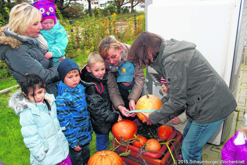 WUNSTORF (tau). Wer hat den dicksten Kürbis? Diese Frage hat der Abfallwirtschaftsbetrieb aha über 110 Kindertagesstätten in der Region Hannover gestellt. Darunter auch die Kita Zwergenwelt in der Portlandstraße. Sie hat sich an dem Wettbewerb, der bereits zum dritten Mal nach 2003 und 2007 stattfand, unter dem Motto "Wer zieht den dicksten Kürbis" beteiligt. In dieser Woche war es nun soweit. Heike Kohpal von aha stand mit dem Maßband vor der Tür und wollte es genau wissen. Stolz präsentierten die Kinder die großen Früchte, die sich aus kleinen Samen entwickelt haben.