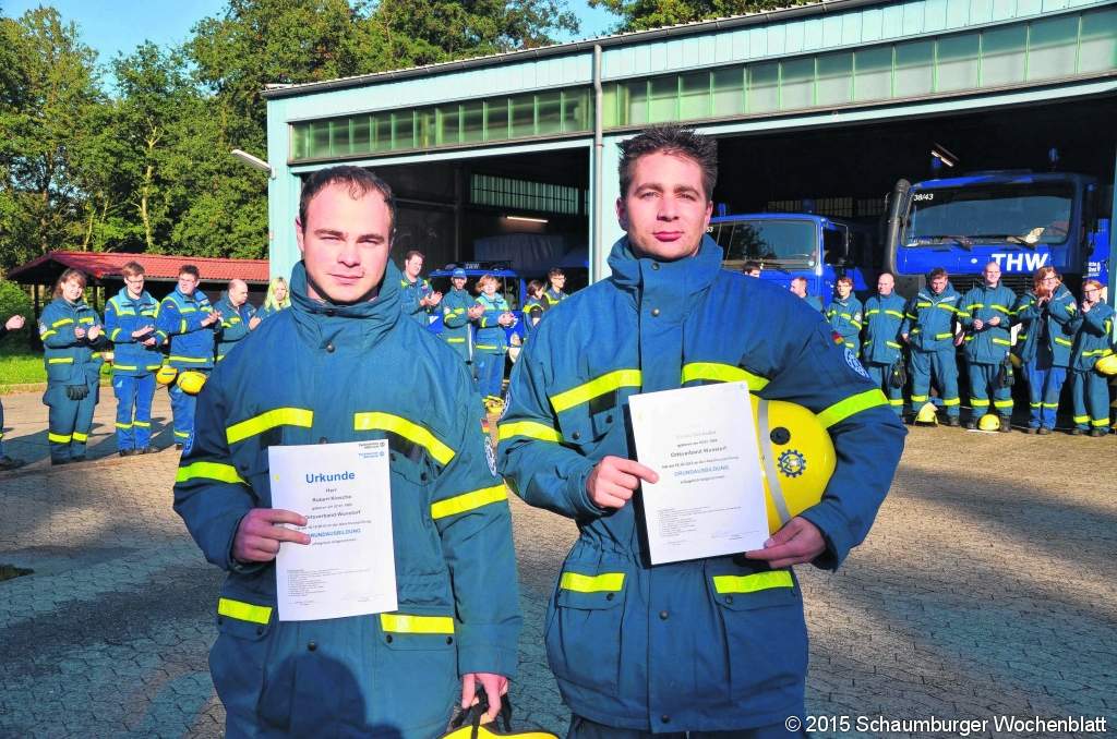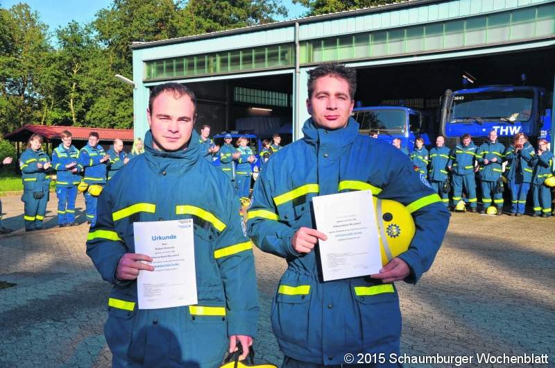WUNSTORF (mk). "Helfen will gelernt sein!" Dieser Grundsatz gilt seit jeher beim THW und in allen Hilfs- und Rettungsorganisationen. Bevor man als Katastrophenschützer in den Einsatz fährt, muss man eine umfangreiche Ausbildung mit einer anspruchsvollen Prüfung absolvieren. Diese legten Robert Kioscha und Marco Schindelar Anfang Oktober in Hannover ab. Nach einer Überprüfung ihrer theoretischen und praktischen Fähigkeiten, schlossen diese alle Teile der Grundausbildungsprüfung erfolgreich ab. Neben dem handwerklichen Geschick und dem korrekten Umgang mit der Technik, wurde auch die Fähigkeit zum Arbeiten im Team überprüft.