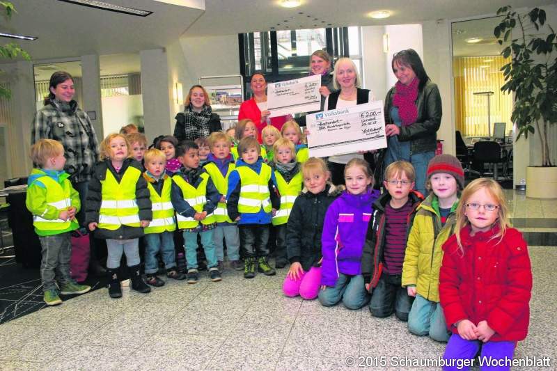 Die Spendensumme ist übrigens der Erlös aus einem Waffel- und Kaffeeverkauf vom letzten Herbstmarkt zum verkaufsoffenen Sonntag. Dort hatte das Volksbankteam extra einen Stand eingerichtet. Beide Kindertagesstätten wollen noch entscheiden wofür sie das Geld ausgeben wollen. Vermutlich wird in neue Spielgeräte für die Außenbereiche der Einrichtungen investiert. Foto: tau