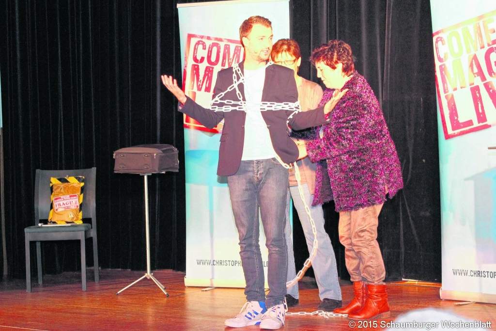 REHBURG (jan). Spaß haben ist die Maxime des Abends gewesen. Zur "Super Spitzen Knaller-Show" mit dem Comedian und Zauberer Christopher Köhler hatte der Rehburg-Loccumer "KulTour-Verein in den Rehburger Bürgersaal eingeladen. "Bescheidenheit ist eine Zier, doch weiter kommt man ohne ihr." Sich diesen Satz von Wilhelm Busch zu Herzen zu nehmen ist sicherlich für einen Comedian eine Grundvoraussetzung und so war es auch nur sympathisch und gut, dass Christopher Köhler jede Bescheidenheit fahren ließ– allein schon mit dem Titel seines Programms macht er schließlich augenzwinkernd darauf aufmerksam, was er von sich selbst und seiner Kunst hält. Für den Rehburg-Loccumer "KulTour-Verein" sei es eine Premiere, diese Mischung aus Comedy und Zauberei auf die Bühne zu holen, sagte dessen Vorsitzender Friedrich Holze zu Beginn. Entsprechend hatte wohl auch das Publikum sich zu großen Teilen entschlossen, die Show zu besuchen ohne richtig zu wissen, wofür es denn überhaupt Eintritt zahlt. Spätestens zur Pause waren alle schlauer, hatten sehr gelacht und mancher bekundete, dass er sich solche Sachen im Fernsehen nie ansehen würde, es hier aber richtig lustig sei. Dass bitteschön niemand erwarten solle, Kabarett geboten zu bekommen, dass es nichts Politisches und keine Pseudo-Botschaften geben würde, bekräftigte Köhler auch gleich zu Beginn. "Ich will einfach gemeinsam mit Ihnen ein bisschen Spaß haben!" Den Spaß brachte er in die Runde mit Zaubertricks – die aber eigentlich nur als Begleitung dienten für das, was er an Comedy unters Volk mischen wollte, und dafür, möglichst vielen Menschen aus dem Publikum die Chance zu bieten, ihren Anteil an der Show zu bekommen. Rauf auf die Bühne und runter von der Bühne ging es den ganzen Abend. Kaum eine Nummer verging ohne dass irgendwer einbezogen wurde. Improvisation wurde dadurch manchmal notwendig – etwa dann, wenn er sich Birgit und Ingrid zu einem Trick auf die Bühne holte, sie anwies, ihn mit langer Kette zu umwinden und diese mit Vorhängeschloss zu sichern. Die Sicherung fiel so aus, dass ihm die Ketten-Enden entgegen fielen. Die geplante Entfesselung musste er also entfesselt improvisieren. Die Lacher hatten gerade dadurch alle drei auf ihrer Seite. Mit typisch norddeutscher Überschwänglichkeit musste der Rheinländer dann an anderer Stelle klarkommen: "Halleluja!" sollte der Gerd rufen, von dem er sich einen 20 Euro-Schein geliehen, diesen zerrissen und schließlich doch unbeschadet zurückgegeben hatte. Das Halleluja kam zwar prompt, allerdings so köstlich trocken ausgesprochen, dass es Köhler nahezu die Show gestohlen hat. Foto: jan