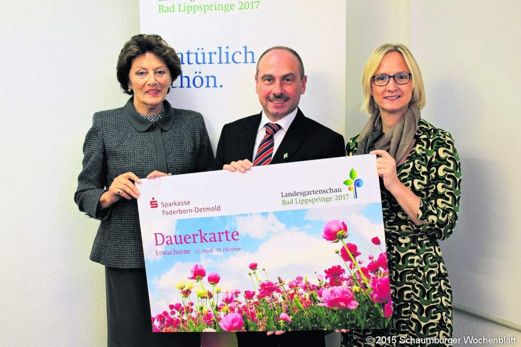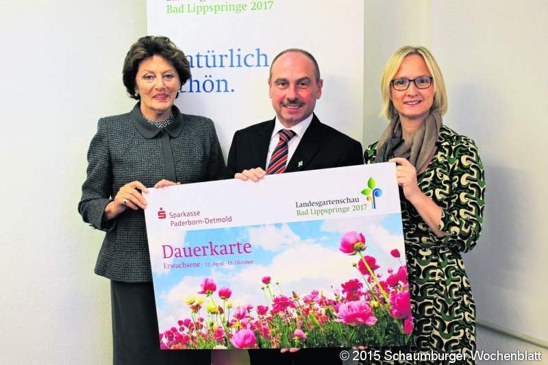 Kreis Lippe/Bad Lippspringe . Bis die Landesgartenschau (LGS) in Bad Lippspringe ihre Pforten für die Besucher öffnen wird, gehen noch 17 Monate ins Land. Ab sofort gibt es in der Tourist Info (Lange Straße, 33175 Bad Lippspringe) allerdings Dauerkarten (Gutscheine) für die am 12. April 2017 startende Schau zu kaufen. Gemeinsam mit Bürgermeister Andreas Bee präsentierten die Unternehmergattin Maja Oetker aus Bielefeld und Maria Prinzessin zur Lippe die ersten Dauerkarten für das Großereignis und dokumentierten damit die Unterstützung der gesamten Region für die LGS 2017. "Die Landesgartenschau in Bad Lippspringe nimmt immer konkretere Formen an. Viele Menschen in unserer Stadt und in der ganzen Region Ostwestfalen-Lippe freuen sich auf unsere Blumenschau mit ihrer einzigartigen Wald-Kulisse. Mit dem frühzeitigen Startschuss für den Verkauf der Dauerkarte kommen wir den vielen Wünschen aus der Bevölkerung entgegen. Die Dauerkarte ist auch ein ideales Geschenk, beispielsweise zum Weihnachtsfest", betonte Bee, der Aufsichtsratsvorsitzender der LGS 2017 ist. Die Dauerkarte sichert allen Interessenten den täglichen Eintritt in die Landesgartenschau, die vom 12. April bis zum 15. Oktober 2017 ihre Tore öffnen wird. Bis zum 31. Januar 2016 ist die Dauerkarte für Erwachsene zum Vorzugspreis von 75,00 Euro erhältlich. Darin enthalten sind das Parken und der Shuttleservice von den Parkplätzen zu den Eingängen am Kaiser-Karls-Park und am Arminiuspark. Dauerkarten-Inhaber können die saisonal wechselnde Blütenpracht und die farbenfrohen Blumenhallen-Schauen zudem ohne Wartezeiten an den Kassen erleben.