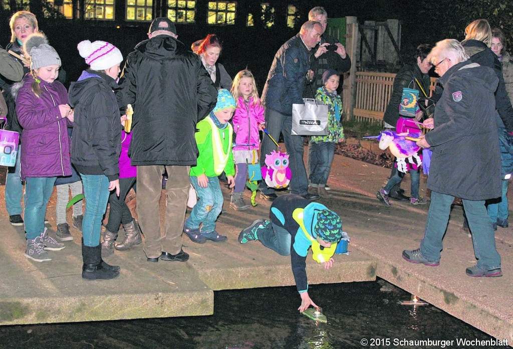 Danach setzte sich der Zug durch die Parkstraße und Lange Straße in Richtung Salzhof in Bewegung. Allen voran ritt hoch zu Roß St. Martin, gefolgt von den Kindern, die viele selbstgebastelte Laternen trugen. Auf dem Salzhof angekommen, setzten die Kinder auf dem Überweg der Salze ihre kleinen Holzboote mit brennenden Kerzen ins Wasser. Allerdings nahm nicht gleich jedes Boot Fahrt auf und die Jugendgruppe der Löschgruppe Bad Salzuflen der Freiwilligen Feuerwehr musste manchmal ein wenig nachhelfen, weil einige Boote durch Strömungen unter den Überweg getrieben wurden. Die kleinen Boote wurden bereits eine Woche vorher gegen eine Spende abgegeben. Mitglieder des Arbeitskreises "Hilfe für behinderte Menschen", der in diesem Jahr die Spenden erhält, waren nicht nur beim Verkauf am Wochenende zuvor anwesend, sondern auch am Martinstag auf dem Salzhof, um auf ihre Arbeit aufmerksam zu machen.