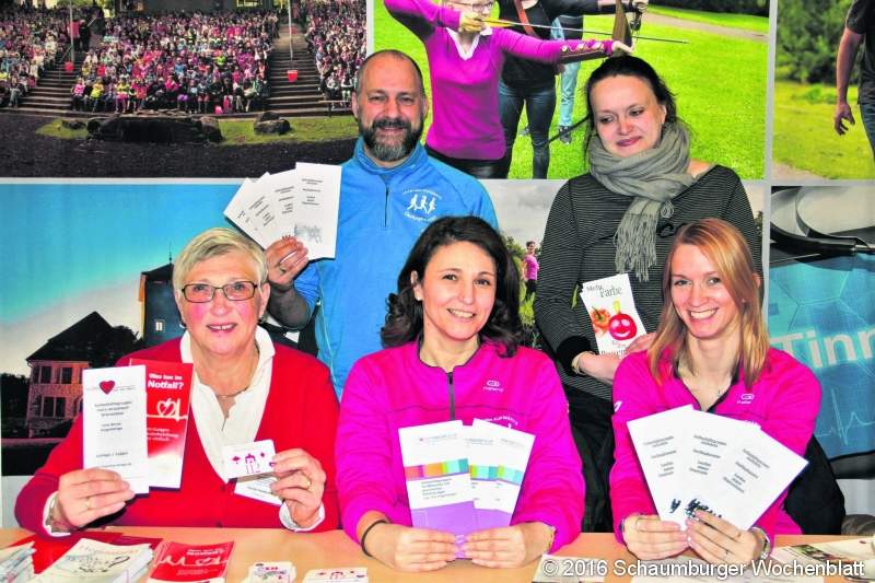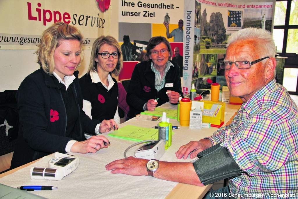An zahlreichen Ständen im Kurgastzentrum konnten sich die Besucher zu gesundheitsrelevanten Themen oder Reha- und Präventionsangeboten informieren. Viel Neugierde herrschte am Tisch des Gesundheitsamtes Lippe, dessen Mitarbeiter eifrig Körperfett-, Blutdruck- und Blutzuckermessungen durchführten. Das Team erzählte: "Landrat Dr. Axel Lehmann hat sich bei uns auch schon durchchecken lassen, nun warten wir noch auf den Bürgermeister." Walter Büker war mit seiner Ehefrau aus Lage angereist, um sich zu informieren. Er machte zuerst einmal den Blutdruck-Check und sagte: "Mein Ergebnis ist gut, aber wer das nicht regelmäßig macht, weiß natürlich nichts darüber – und gerade Bluthochdruck ist lebensgefährlich!" Ein weiterer Stand bot Einblicke in die Arbeit der Selbsthilfe-Kontaktstelle und verschiedener Selbsthilfegruppen für psychisch erkrankte Menschen und Herz-Kreislauf-Erkrankte sowie deren Angehörige. Hier ist Gerda Hadamek schon über acht Jahre tätig; sie rät: "Nach einer Herz-Operation ist es wichtig, Kontakte knüpfen zu können." Oliver Kaiser betreut die Selbsthilfegruppe "Aufwärts" und erklärte: "Wir laufen gegen Depressionen, denn das Laufen fördert den sozialen Kontakt und das Selbstvertrauen." Vor Ort konnten die Besucher auch die eine oder andere Sportart aktiv kennenlernen. Die Teilnehmer eine Probestunde "Körper in Balance" mit KSB-Übungsleiterin Heike Raczak bemerkten dabei schnell, wie wohltuend die Übungen sind und welch ein fröhliches Gefühl aufkommt, wenn man in der Gruppe trainiert und es nicht um Leistung geht, sondern darum, fit und beweglich bleiben. Neu beim diesjährigen Gesundheitstag war die Teilnahme des Stadtsportverbandes Horn-Bad Meinberg, unter dessen Federführung örtliche Sportvereine in der Turnhalle der Grundschule ein umfassendes Mitmachprogramm auf die Beine gestellt hatten. Besonders die Kleinen hatten große Freude beim Kinderbewegungsabzeichen des Landessportbundes (KIBAZ) unter der Leitung von Anke Stücke. Abschließend kamen bei fetziger Zumba-Fitness die Teilnehmer alle richtig ins Schwitzen.