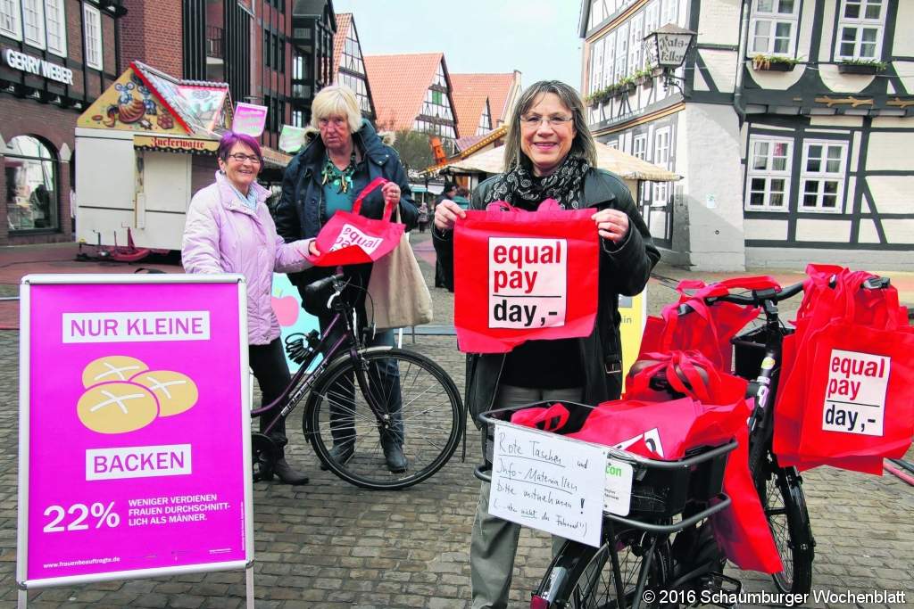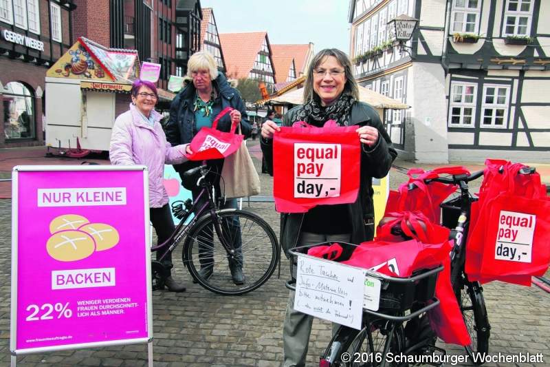 WUNSTORF (gi). Der "Equal Pay Day" markiert symbolisch den geschlechtsspezifischen Entgeltunterschied, der laut Statistischem Bundesamt in Deutschland aktuell 22 Prozent beträgt. Umgerechnet ergeben sich daraus 79 Tage und somit das Datum des diesjährigen Equal Pay Days am 19. März, bis zu dem Frauen umsonst arbeiten – oder anders ausgedrückt: erst am 19. März 2016 haben Frauen in Deutschland so viel verdient wie Männer schon am 31. Dezember 2015. Der Tag soll auf die Ungleichbezahlung von Frauen und Männern hinweisen. Entstanden ist er für gleiche Bezahlung 1988 in den USA. Mittlerweile findet der Tag auch in 20 europäischen Ländern statt, in Deutschland seit 2008 auf Initiative des "Business and Professional Women" (BPW) Germany. Sinnbild für die "roten Zahlen" in den Geldbörsen der Frauen sind die roten Taschen, die bundesweit zum Symbol für den Equal Pay Day wurden. Vor dem Wunstorfer Rathaus wehte am 19. März die offizielle Equal Pay Day-Fahne. Die Gleichstellungsbeauftragte der Stadt macht an diesem Tag mit einer Plakataktion und dem Verteilen von roten Taschen in der Innenstadt auf Ursachen und Folgen des geschlechtsspezifischen Entgeltunterschiedes aufmerksam: In Deutschland arbeiten 45 Prozent aller erwerbstätigen Frauen in Teilzeit (Männer lediglich zu neun Prozent), oftmals in Niedriglohnjobs und in kleinen Betrieben ohne Tarifbindung oder in Branchen, in denen weniger bezahlt wird als in "männertypischen" Branchen. Langfristig hat dies deutliche Folgen für die Altersversorgung: Derzeit bekommen 63 Prozent der Frauen weniger als 650 Euro Rente. Foto: gi