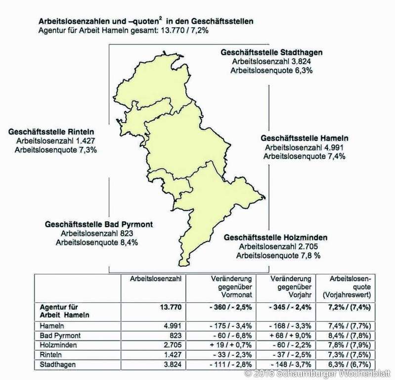 Nach dem starken Zugang an neu gemeldeten offenen Stellen im Februar, ließ die neue Nachfrage nach Arbeitskräften im März etwas nach: 875 offene Arbeitsstellen wurden zur Besetzung gemeldet – 142 Stellen weniger als im Vormonat (-14,0 Prozent). In den ersten drei Monaten seit Jahresbeginn wurden 2.621 offene Stellen gemeldet, 91 mehr als im gleichen Zeitraum des Vorjahres (+3,6 Prozent). Mit Blick auf die aktuell veröffentlichten Zahlen zum Ausbildungsstellenmarkt zog Ursula Rose, Vorsitzende der Geschäftsführung bei der Agentur für Arbeit Hameln, Halbjahresbilanz: "Die Kräfteverhältnisse auf dem Ausbildungsstellenmarkt verschieben sich zugunsten der jungen Menschen, die eine Ausbildung suchen. Zur Halbzeit des Berufsberatungsjahres gab es im März mehr gemeldete Lehrstellen, die noch unbesetzt waren, als gemeldete Bewerber um eine Ausbildungsstelle, die noch nichts gefunden hatten. Viele dieser bisher noch unversorgten jungen Menschen haben, neben der Suche nach einer Lehrstelle, noch die Option eines weiteren Schulbesuches in der Hinterhand. Um die Bewerber als künftige Azubis an sich zu binden, sollten sich Ausbildungsbetriebe schnell entscheiden und möglichst nach den Osterferien Zusagen verschicken." Für das aktuelle Berufsberatungsjahr, das vom 1. Oktober 2015 bis zum 30. September 2016 läuft, wurden Zahlen veröffentlicht. Bisher wurden insgesamt 2.374 Ausbildungsplätze zur Besetzung gemeldet, ein Plus von 24 Lehrstellen gegenüber März des vergangenen Jahres (+1,0 Prozent). Die Zahl der Jugendlichen, die sich bisher auf der Suche nach einer Lehrstelle bei der Berufsberatung als Bewerberinnen und Bewerber gemeldet haben, ist gegenüber dem Vorjahr um 74 auf 2.506 gesunken (-2,9 Prozent). Damit hat sich das Ungleichgewicht zwischen den gemeldeten Ausbildungssuchenden und Ausbildungsstellen weiter verkleinert. Während die Zahl der arbeitslos gemeldeten Männer und Frauen in den Landkreisen Hameln-Pyrmont und Schaumburg im März zurück ging (Hameln-Pyrmont: -3,8 Prozent / Schaumburg: -2,7 Prozent) stieg sie im Landkreis Holzminden an (+0,5 Prozent). Saisonale Ursache für die gesunkene Arbeitslosigkeit in den Landkreisen Hameln-Pyrmont und Schaumburg waren die verstärkten Arbeitsaufnahmen, wovon überwiegend die arbeitslos Gemeldeten im Versicherungsbereich der Arbeitsagenturen profitierten. Bei den gestiegenen Arbeitslosenzahlen im Landkreis Holzminden kommen die Flüchtlinge zum Tragen, die zunehmend bei der Arbeits- agentur, aber auch dem Jobcenter arbeitslos gemeldet sind. Im Vorjahresvergleich liegt die Arbeitslosenzahl in allen drei Landkreisen weiterhin unter dem Vorjahresniveau bei unterschiedlicher Ausprägung (Hameln-Pyrmont:- 1,8 Prozent; Holzminden: - 1,9 Prozent; Schaumburg: - 3,4 Prozent).