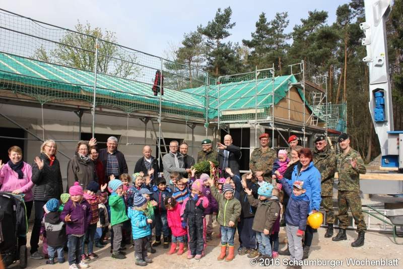 Augustdorf (cp). Die Plätze in der neuen Gruppe der Kita "Stachel-Bär" sind bereits belegt. Derzeit wird hart daran gearbeitet, dass die Kinder ab August auch ein Dach über dem Kopf haben. Am Mittwoch wurde am Erweiterungsbau Richtfest gefeiert.
