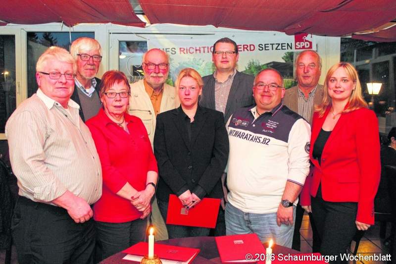 Viele Kandidaten für die Kommunalwahlen am 11. September hätten sie schon, sagte der SPD-Vorsitzende Jürgen Wagner. Das schließe weitere Anwärter aber nicht aus. Erst am 30. Juni würden die Listen für Stadtrat und Ortsräte geschlossen. Völlig neu auf der Liste sind der Rehburger Sven Bohlens, sowie die Münchehäger Iris Wesling und Mirco Wagner. Im Gegenzug wollen der Münchehäger Kay Anders und der Loccumer Walter Bulmahn nicht erneut kandidieren. Den Blick richtete der Ortsverein aber auch schon auf die Bundestagswahlen 2017. Aus seinen Reihen hat die Münchehägerin Marja-Liisa Völlers eine Bewerbung zur Kandidatur für die SPD abgegeben. Nach kurzer Darstellung ihrer Motivation und Ziele gab es aus der Versammlung ein einstimmiges Votum für diese Kandidatur – Völlers kann auf "ihren" Ortsverein zählen. Rückblicke standen dann noch im Mittelpunkt angesichts der Auszeichnung langjähriger Mitglieder. Der Beitritt von Peter Jürgen Sult liegt bereits 60 Jahre zurück, der von Addi Handwerker 40 Jahre. Seit 25 Jahren sind Angelika Teßner und Walter Bulmahn in der SPD und vor zehn Jahren holten sich Matthias Reising, Gitte Gröger und Carsten Schmidt das Parteibuch. Foto: jan